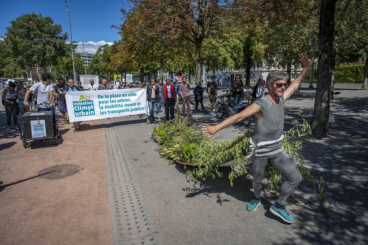 À Genève, cette initiative cantonale législative demande (comme ailleurs) que, chaque année pendant 10 ans, 1% de la voie publique soit transformée pour moitié en espaces verts et arborés et pour moitié en voies de mobilité durable (piétons, vélos, sites propres tpg) en prenant sur les espaces actuellement accessibles au trafic motorisé individuel. Pour son application l’initiative sera libérée de l’emprise de la loi sur la compensation du stationnement afin de faire avancer les projets urbains d’aménagement.