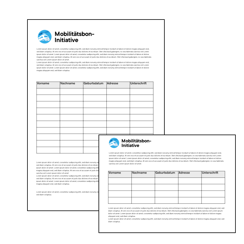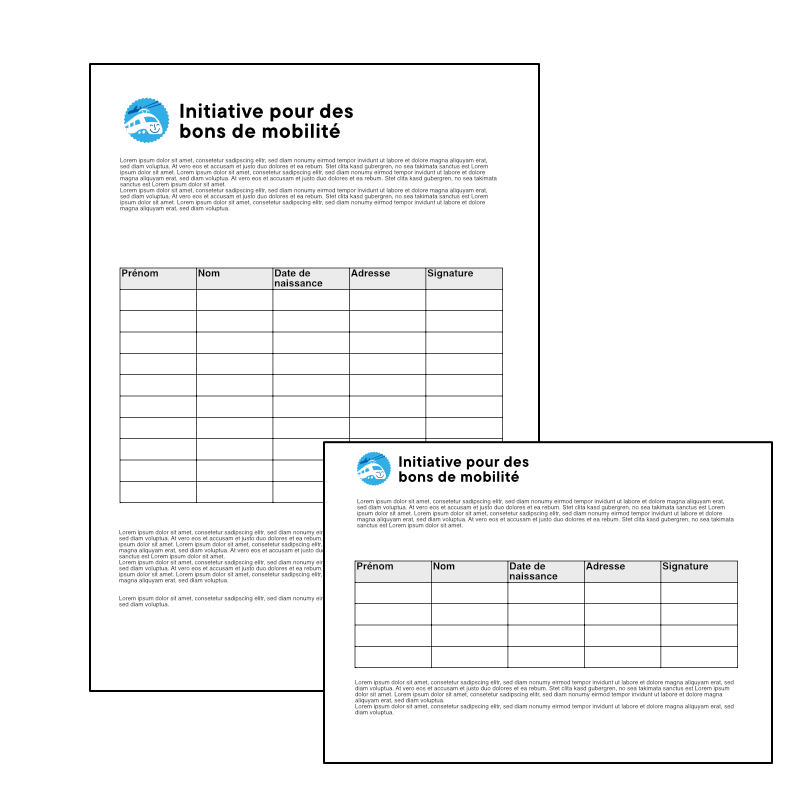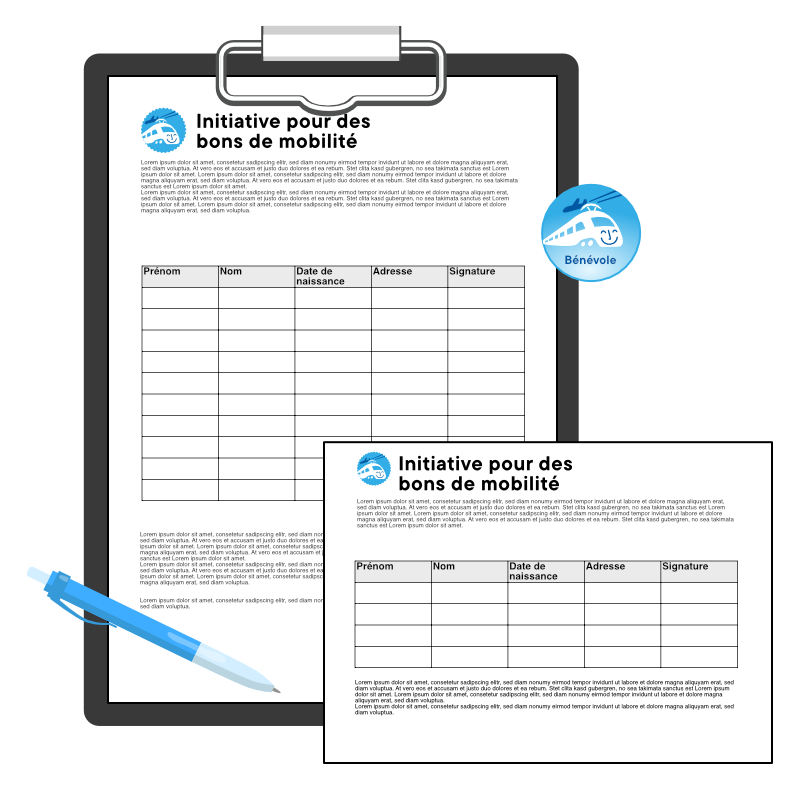 Merci beaucoup pour votre soutien actif! Ensemble, nous parviendrons à récolter les 100'000 signatures nécessaires à l'aboutissement de l'initiative "pour des bons de mobilité", en seulement 6 mois!
