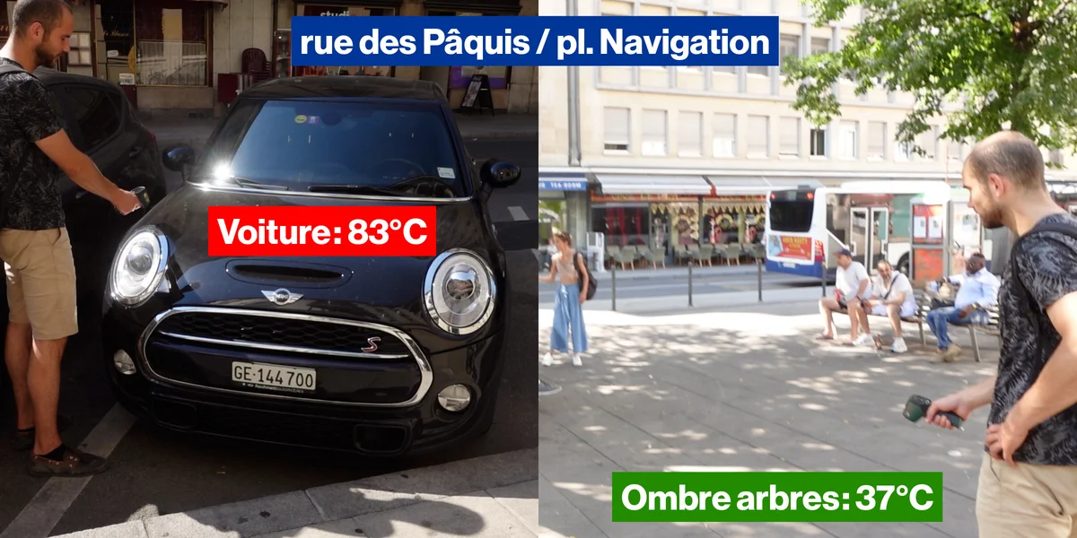 À la rue des Pâquis, là où a eu lieu l’action de jardin participatif qui a tant fait parler, le trottoir exposé au soleil atteint 50.1°C. Le capot d’une voiture noire au soleil atteint même la mesure la plus élevée que nous ayons pu enregistrer: 83.1°C! Soit bien assez pour faire cuire un œuf au plat (70°C suffisent)... Quelques mètres plus loin, à la place de la Navigation, sous un arbre, la température du sol n’est plus que de 37°C, démontrant le fort pouvoir rafraîchissant des arbres, par contraste avec l’accumulation impressionnante de chaleur des véhicules et de l’asphalte.