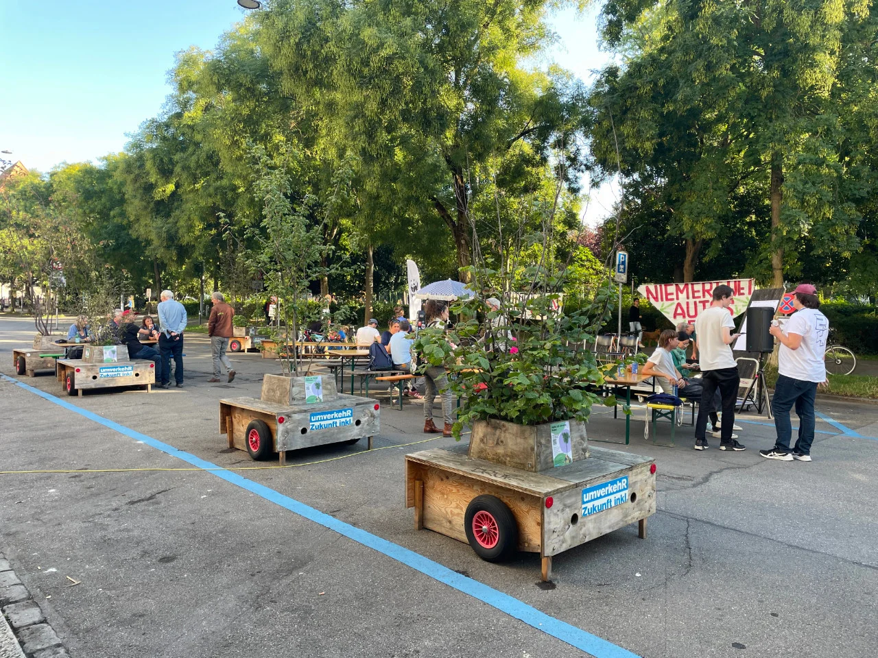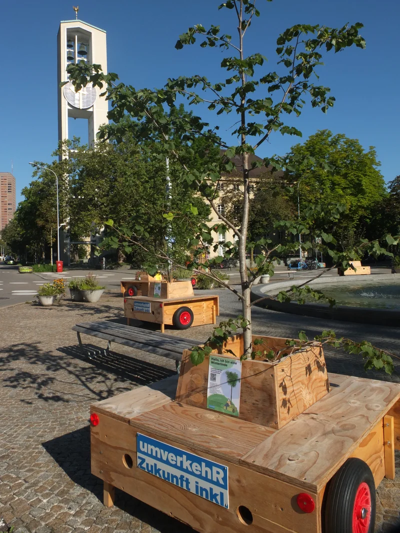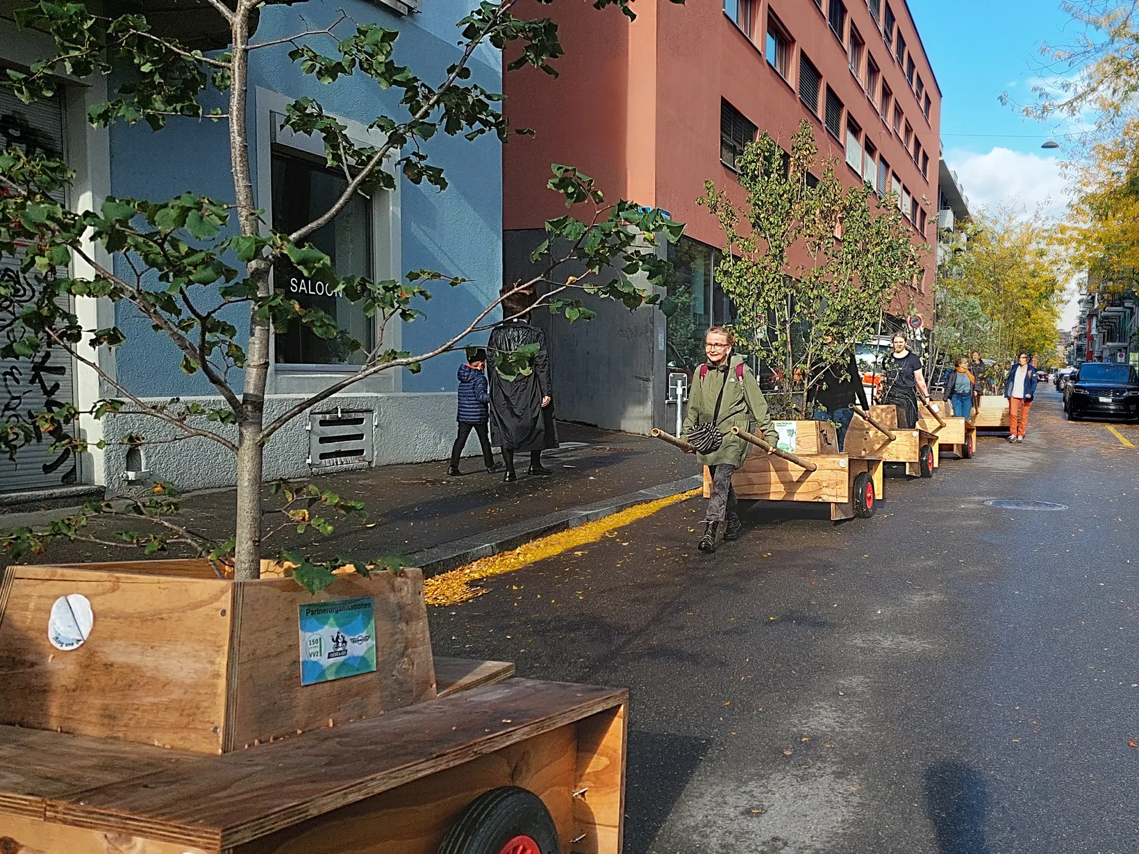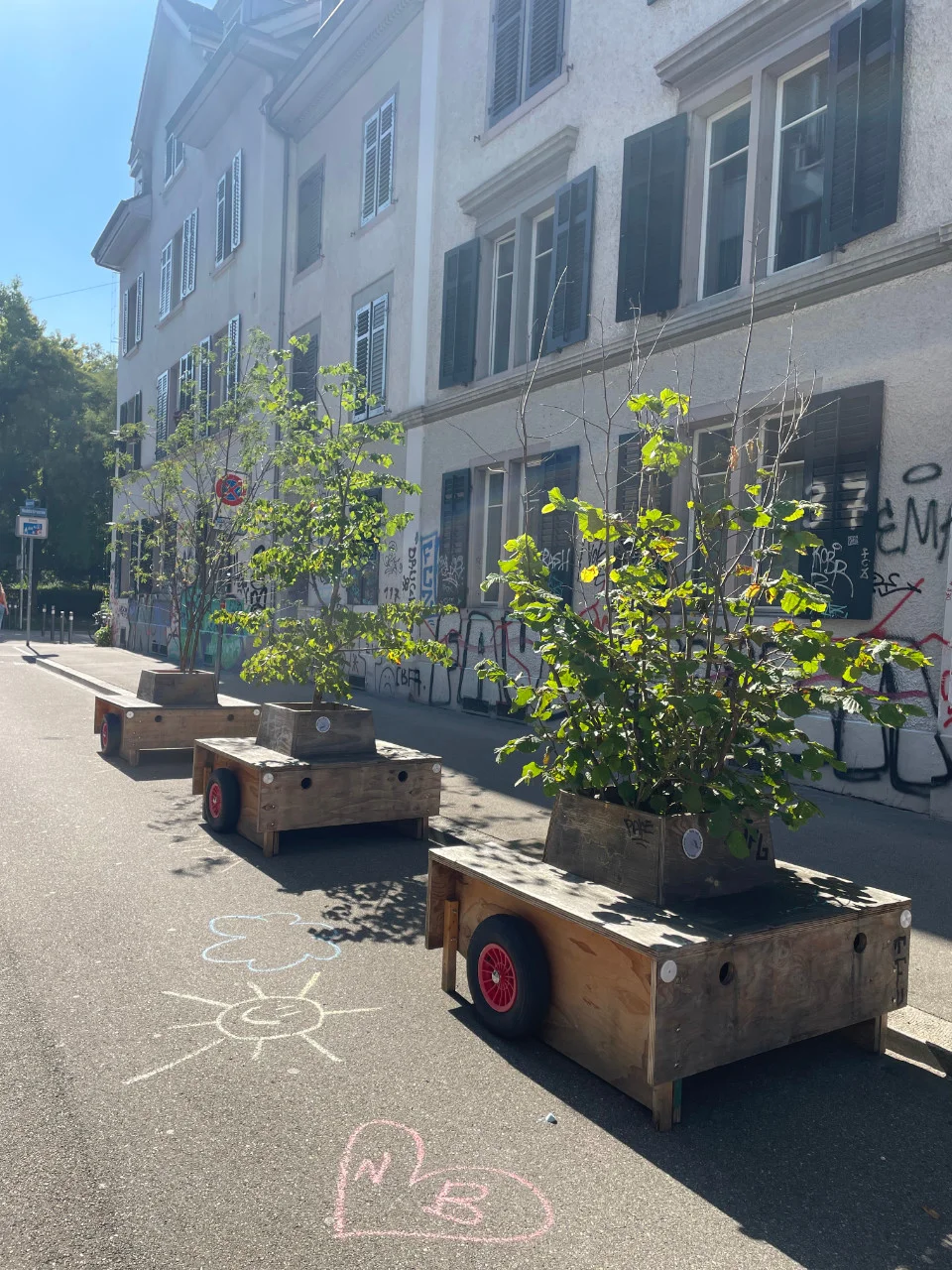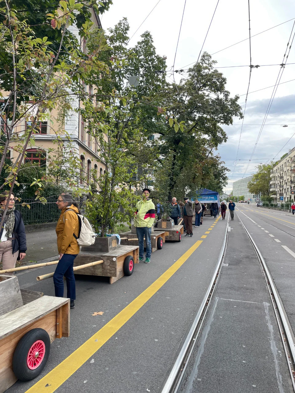 Bäume senken durch Schatten und Verdunstung die sommerliche Hitze um bis zu 10 Grad. Mit den Wanderbäumen zeigen wir auf, wie es wäre, wenn anstatt Autos mehr Bäume in der Stadt wären. Zwar haben wir mit dem Gegenvorschlag der Stadtklima-Initiativen einen Schritt in die richtige Richtung gemacht, doch weil die Mühlen der Politik sehr langsam malen, begrünen wir mit unserer Wanderbaumallee die Quartiere schon heute 🌳