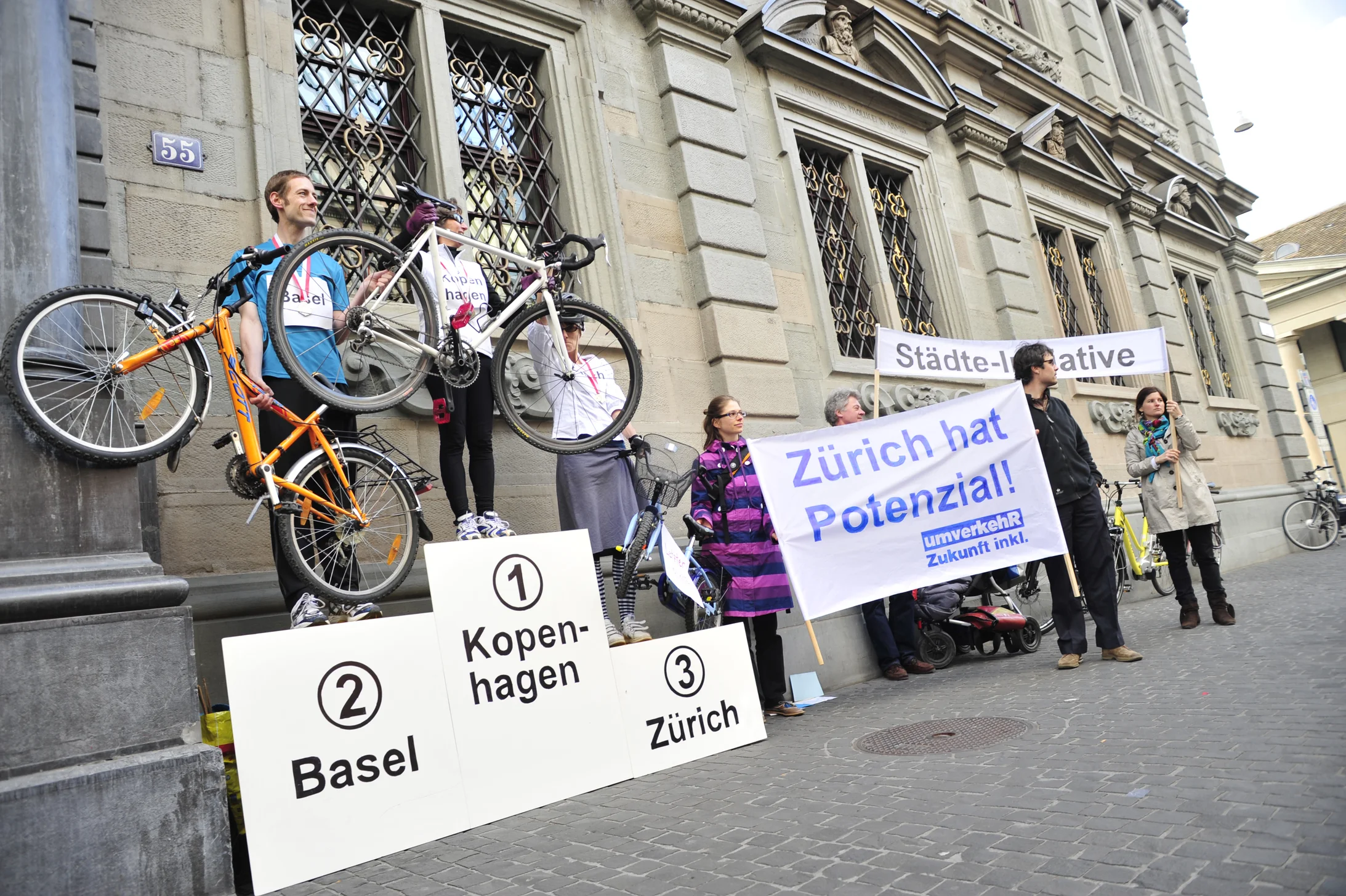Mit einem Velorennen hat die Umweltorganisation umverkehR heute Nachmittag für die Städte-Initiative geworben, über die der Gemeinderat am Abend debattiert. Im Velorennen blieb das Zürcher Dreirad weit hinter dem Rennvelo von Kopenhagen und dem Kindervelo von Basel zurück. umverkehR macht mit der Aktion darauf aufmerksam, dass Zürich im Vergleich zu anderen Städten noch ein grosses Potenzial zur Verbesserung der Alternativen zum Autoverkehr hat.