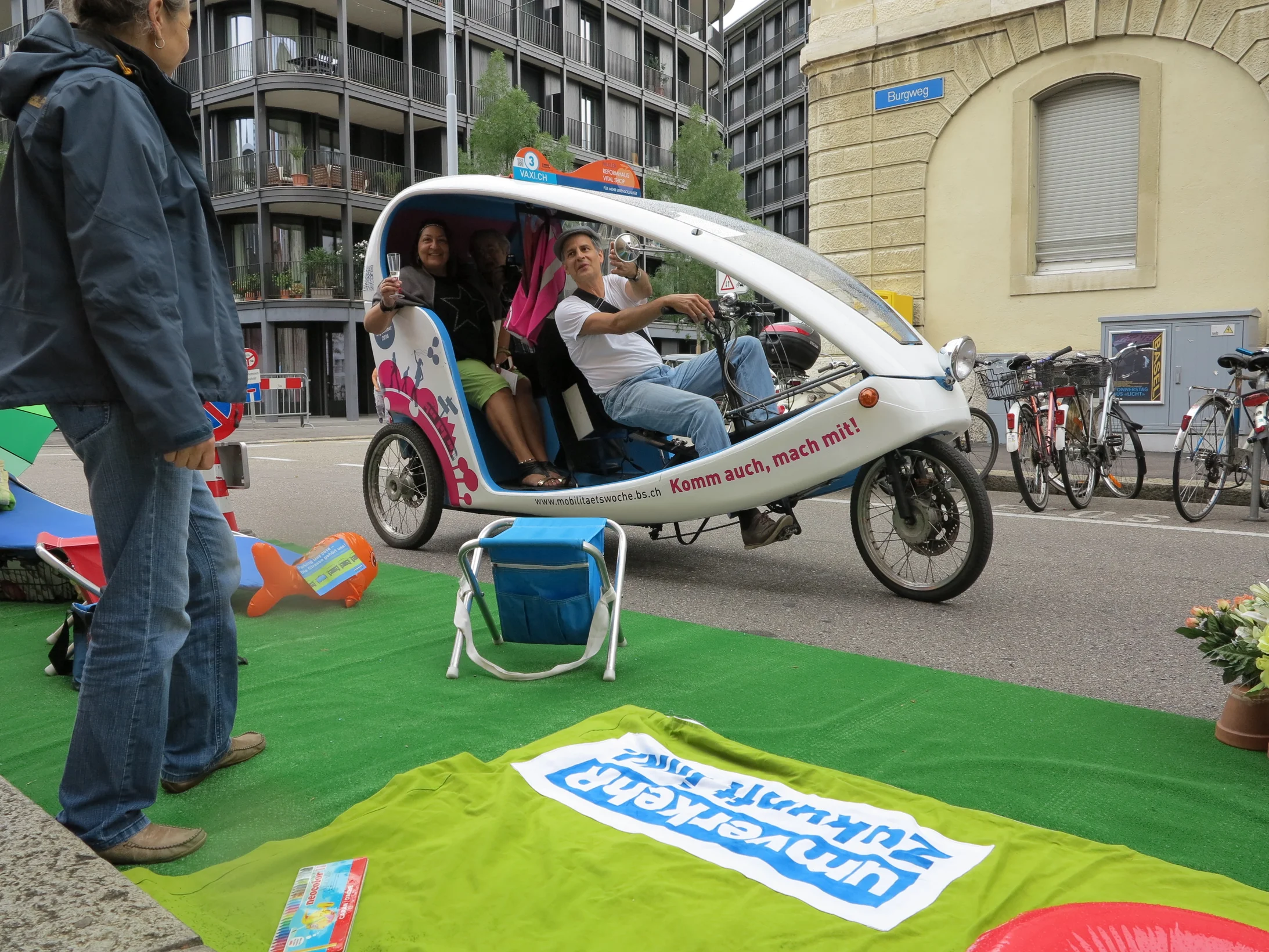 umverkehR brachte gestern den internationalen PARK(ing) Day auch nach Basel. In Basel wurden mehrere Parkplätze an der Maulbeerstrasse und an der Alemannengasse umgestaltet. Es gab Zeit und Platz zum Verweilen, Spielen, Essen, Trinken und Musizieren oder um sich über umverkehR zu informieren. Ausserdem gab es die Möglichkeit mittels Velotaxi vom einen Parking Day Standort zum anderen zu gelangen.