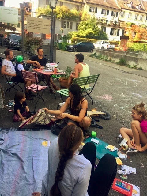 Im Outdoor- Wohnzimmer  Kaffee und Tee trinken und über die Zukunft des Quartiers diskutieren von Antonia beim Röschibachplatz am PARK(ing) Day 2020 in Zürich